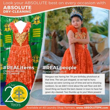 We show only REAL results from REAL customers — like Ms. ALYSSA'S Gown dry-cleaned by ABSOLUTE. If you think about it, small lies, even about garment care are a SCAM, just like the trillion Pesos stolen from our country started with a small lie—false claims and fake ads.