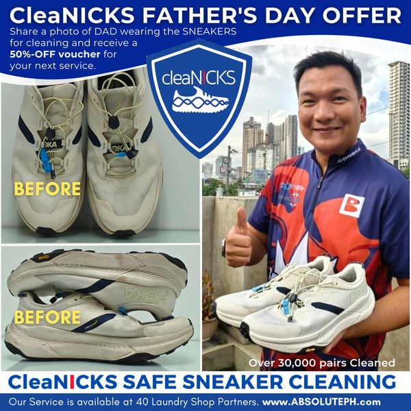 YES, sneaker service is included in the Father's Day offer! Get Papa's shoes CleaNICKed and share a photo of Dad wearing the sneakers for cleaning just like 𝗣𝗮𝗽𝗮 𝗔𝗻𝗱𝗿𝗲𝗶. As a thank you for your thoughtfulness, we'll give you a 50%-OFF voucher for your next CleaNICKS service.