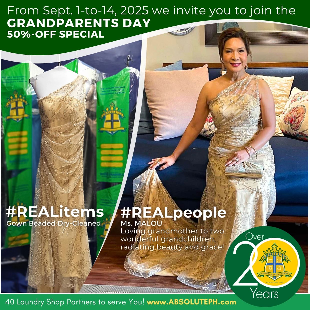Honor your grandparents by helping them look their ABSOLUTE best—just like Ms. Malou, a loving grandmother to two! From September 1 to 14, 2025, share a photo of your grandparents wearing the item for dry-cleaning or sneaker cleaning, and as a thank you for keeping Lolo and Lola looking their best, enjoy 50% off your next dry-cleaning service.