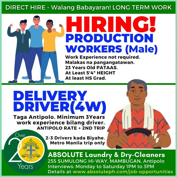 a) Libre mag Walk-in application. Walang babayaran kahit singko upang mag apply sa ABSOLUTE Laundry & Dry-Cleaners.